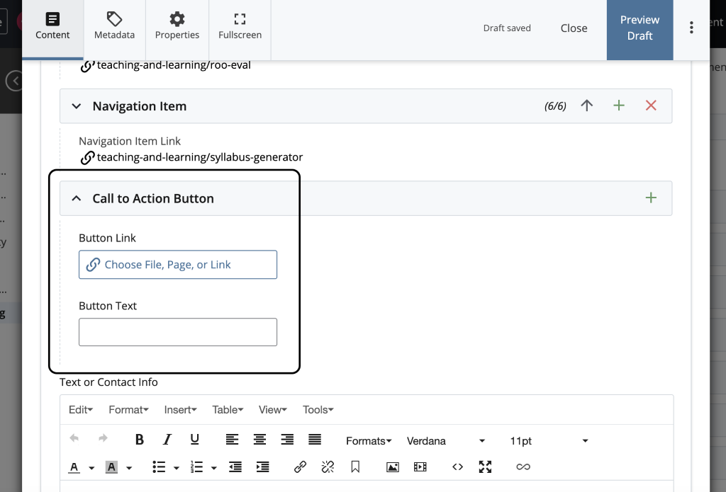 1.) Find your Sidebar and select 'Edit' (for these steps, please refer to the 'Sidebar' page in this curriculum section). You will then scroll to the bottom of the 'Navigation Items' list to find the 'Call to Action Button' section. Select the accordion to open the field.