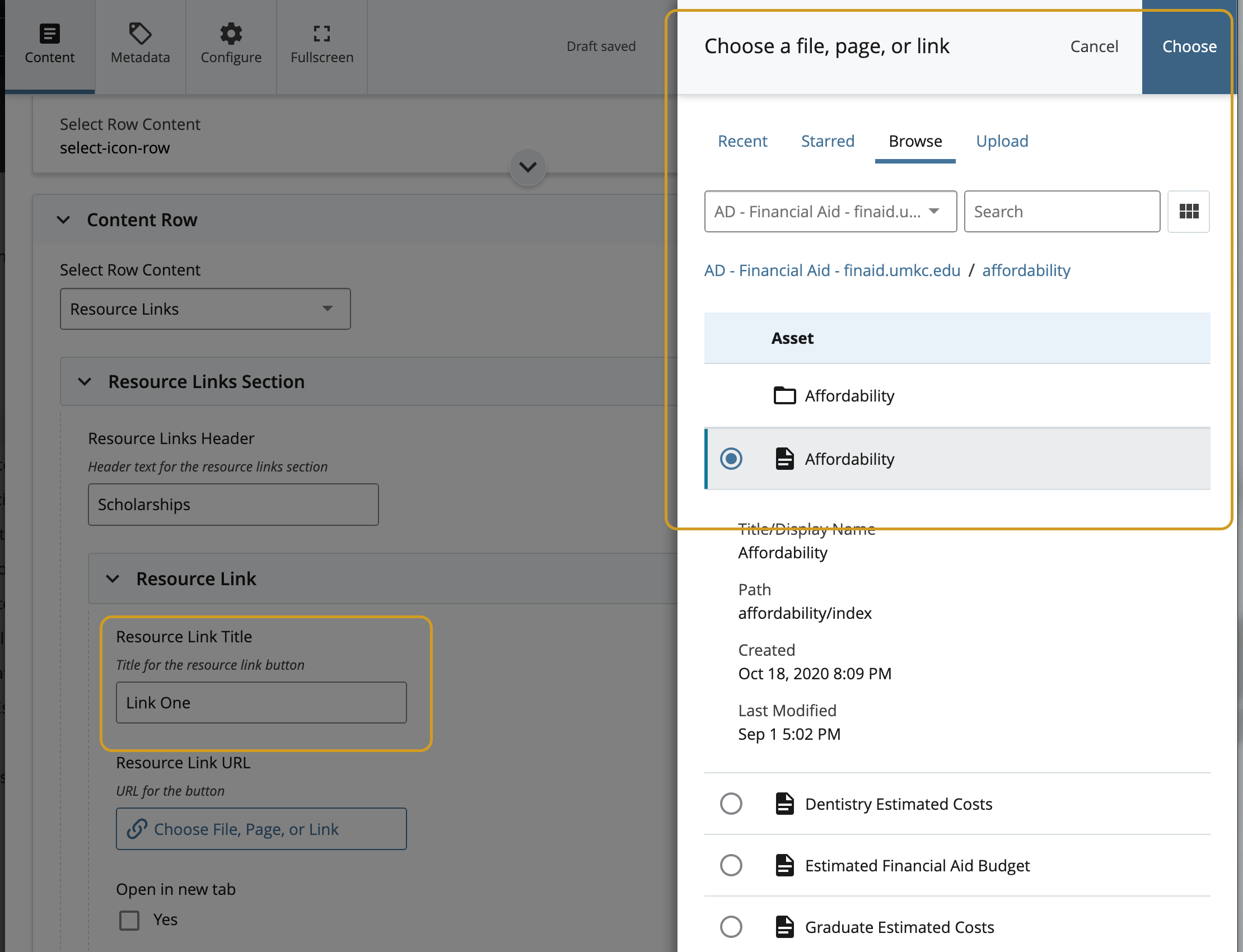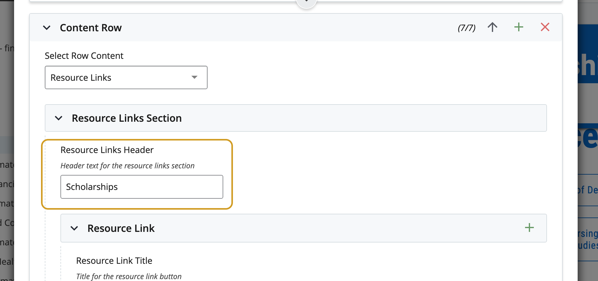 Add a new content row and in the 'Select value...' drop-down select Resource Links, or find the content row labeled 'select-resource-links' and select to open.