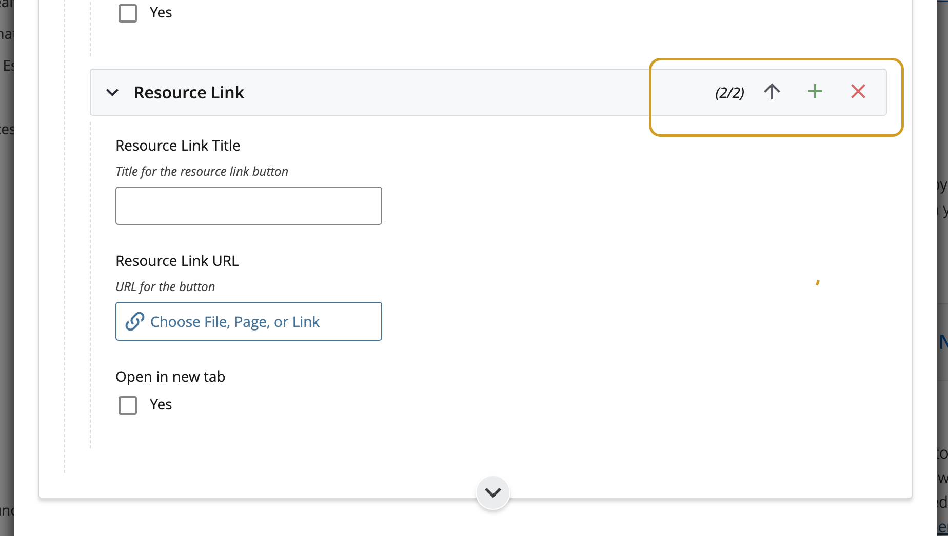 Once you have added more than one resource link, you can use the green plus to add more links, the red x to delete links, and the arrows to rearrange links in the row.
