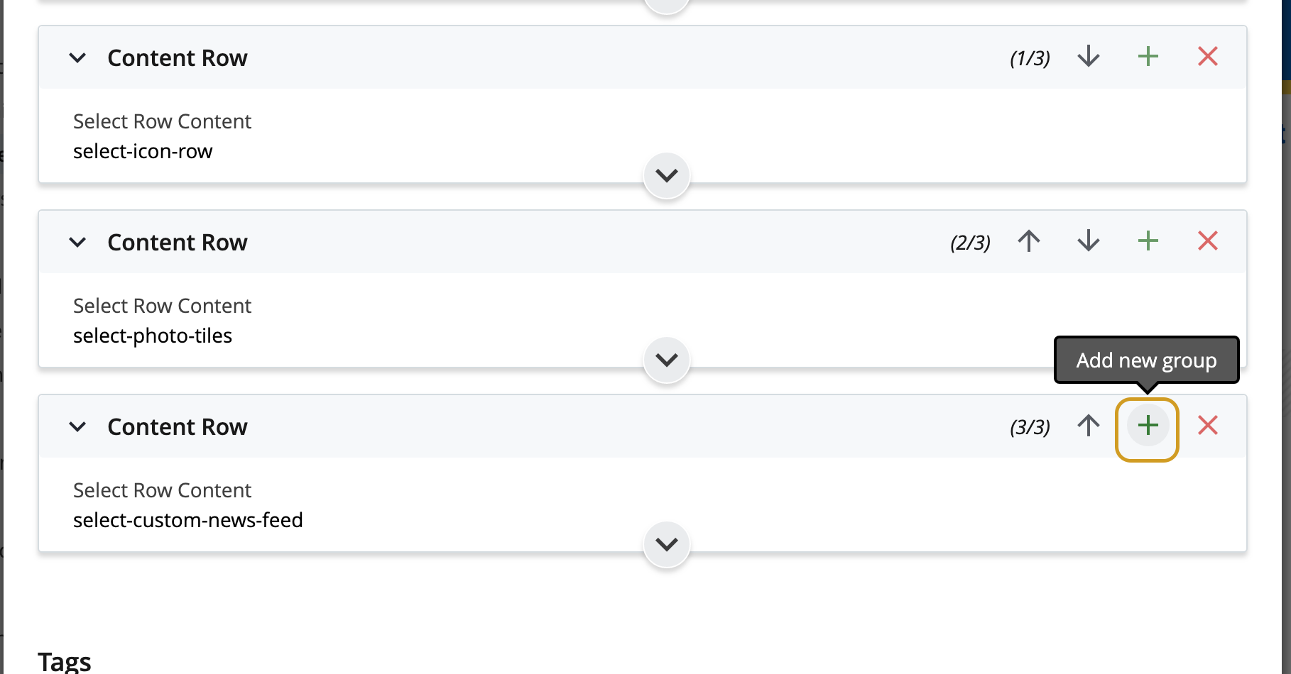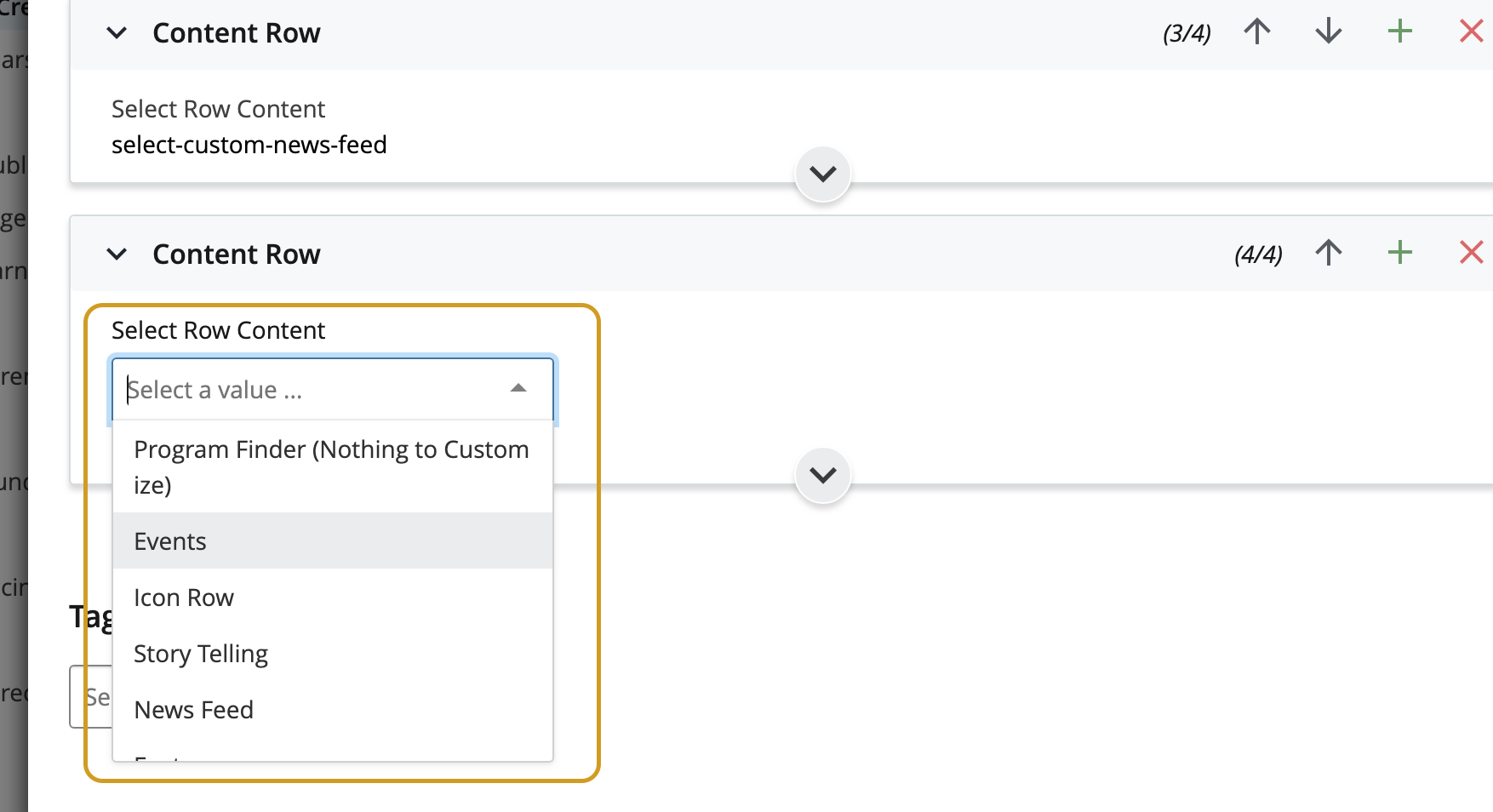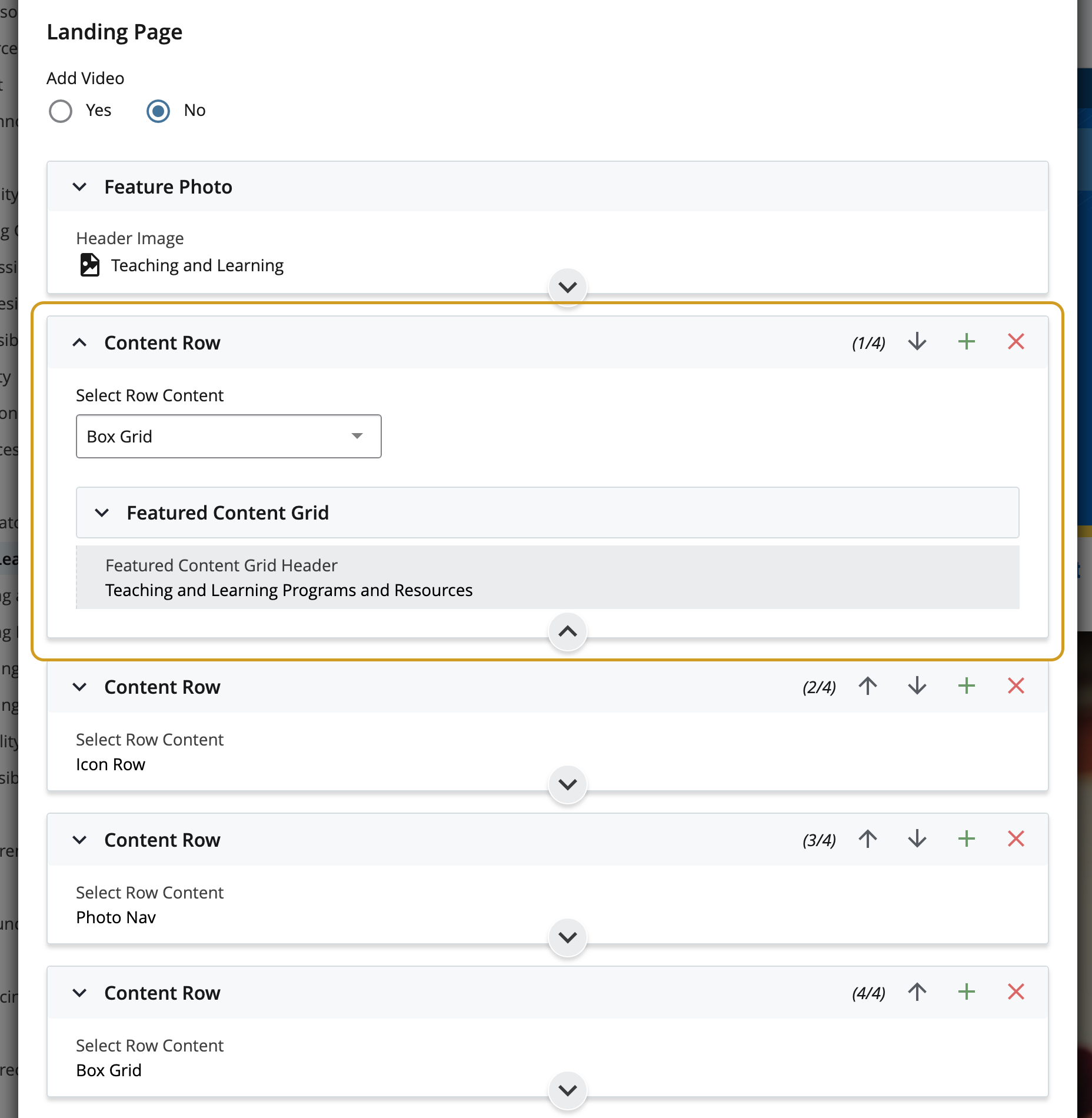 Open the editing window on your chosen page. You will see a list of drop-downs labeled 'Content Row', with secondary headers labeled things like 'select-box-grid', 'select-resource-links', etc. These are the content rows that make up your page's content. To view the Content Row's content, simply select the drop-down to open it further.