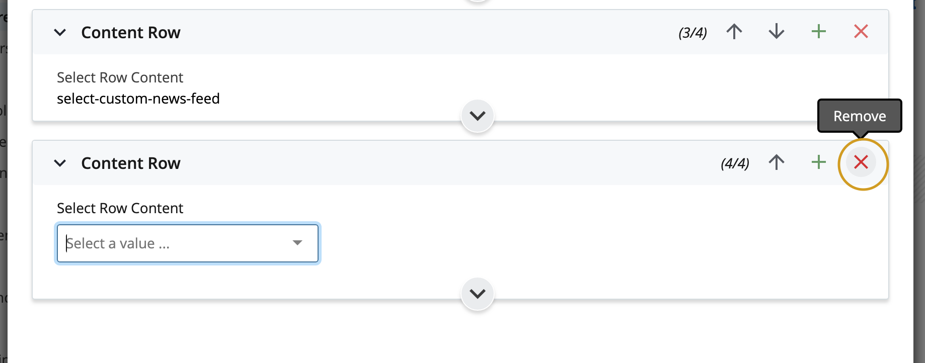 Select the red 'X' on the Content Row that you would like to delete. Cascade will refresh, and your content row will be gone.