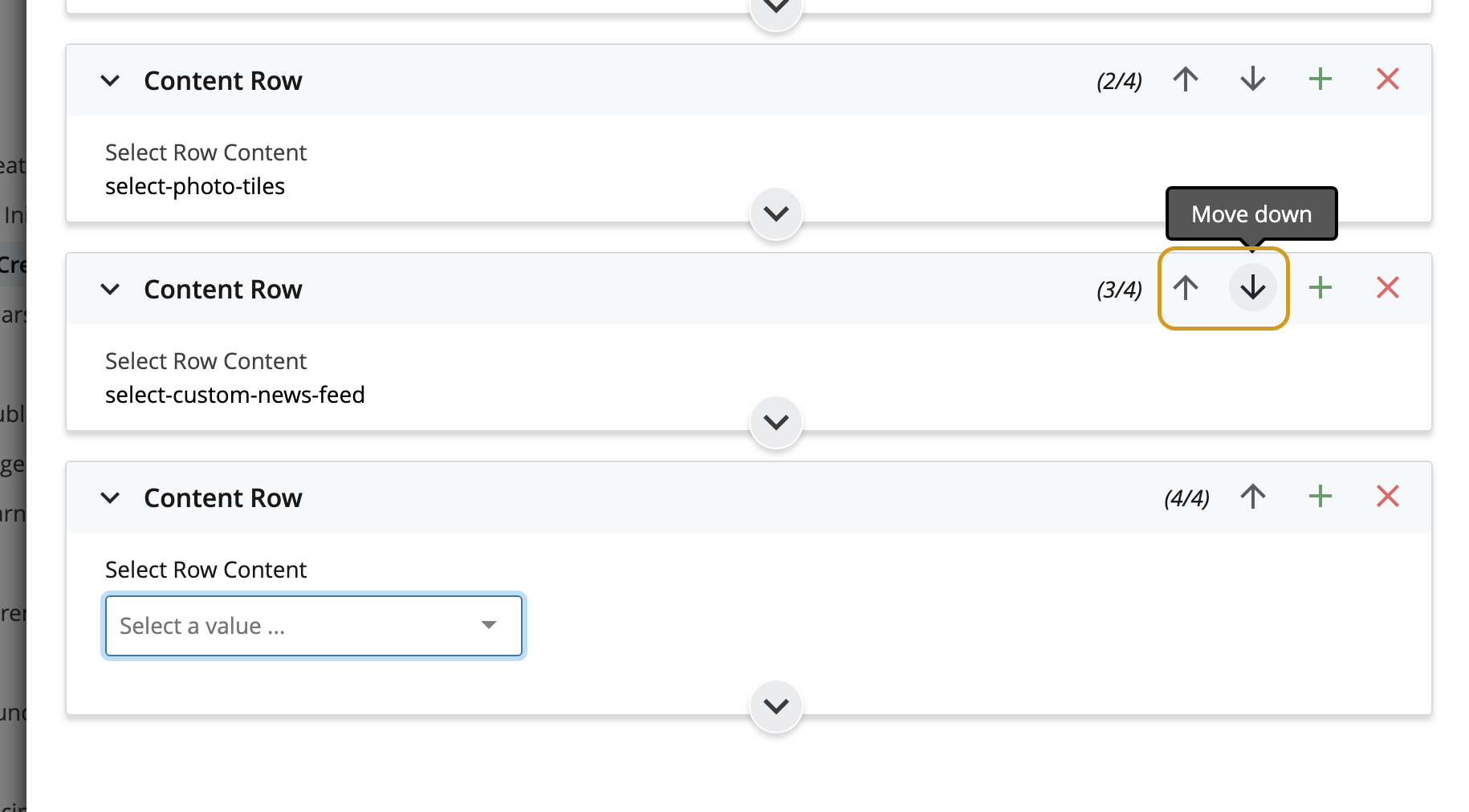 If you are happy with the content on your page but would like to rearrange the content rows, use the arrows to move chosen content rows on the page. Cascade will refresh, and your content row will be in its new position.